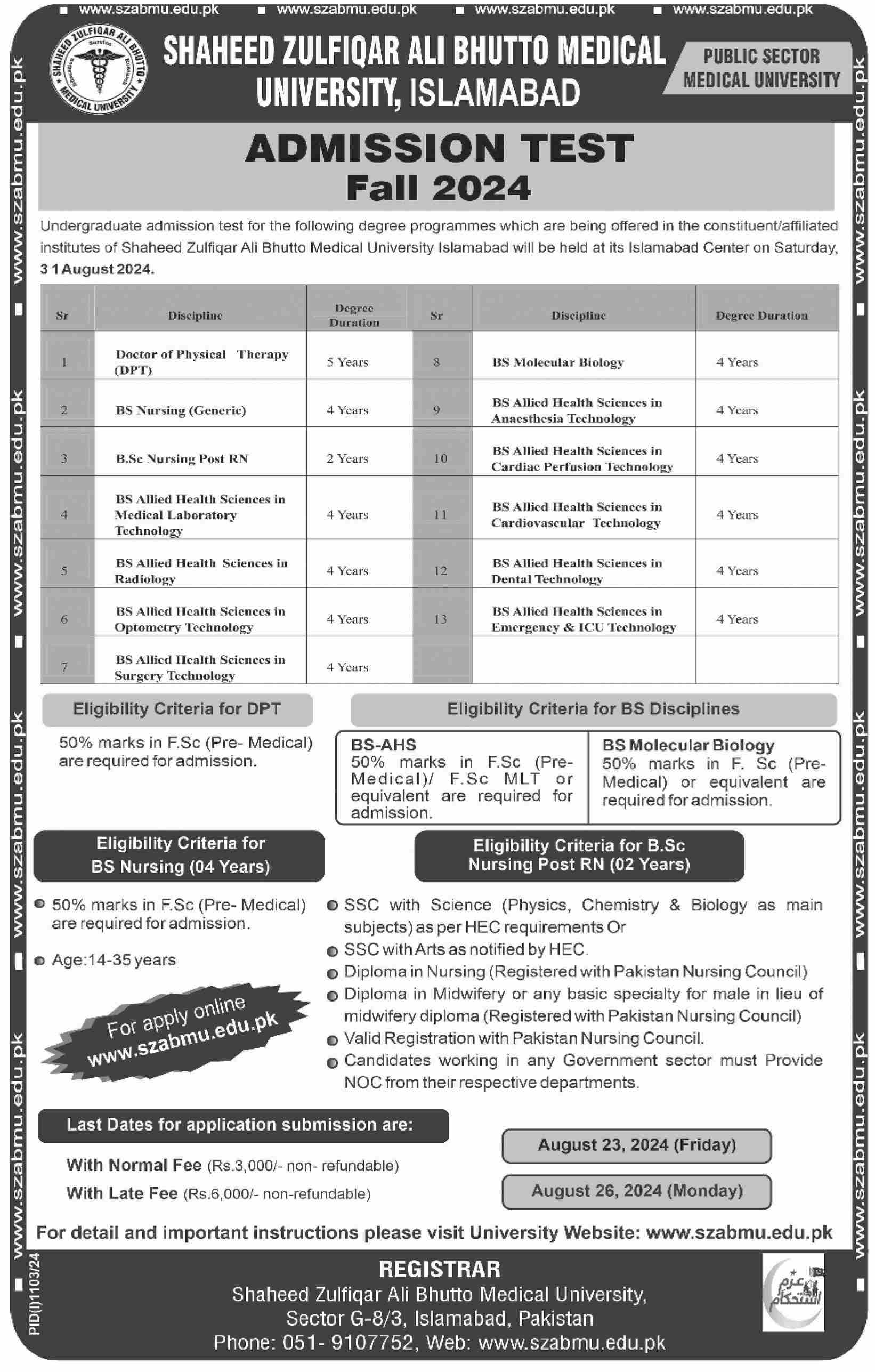 Shaheed Zulfiqar Ali Bhutto Medical University SZABMU admissions 2024 for Doctor of Physical Therapy, Nursing, Nursing Post RN, Molecular Biology, Allied Health Sciences in Medical Laboratory Technology has been announced. Shaheed Zulfiqar Ali Bhutto Medical University SZABMU Islamabad Islamabad Pakistan welcomes students to apply for admissions in academic year 2024 in Medical University. Students who want to enroll for academic session 2024 in BSc Hons, DPT and BS qualification and admission criteria for Government institute can apply till last date 26 August 2024. Read newspaper ad for exact details.