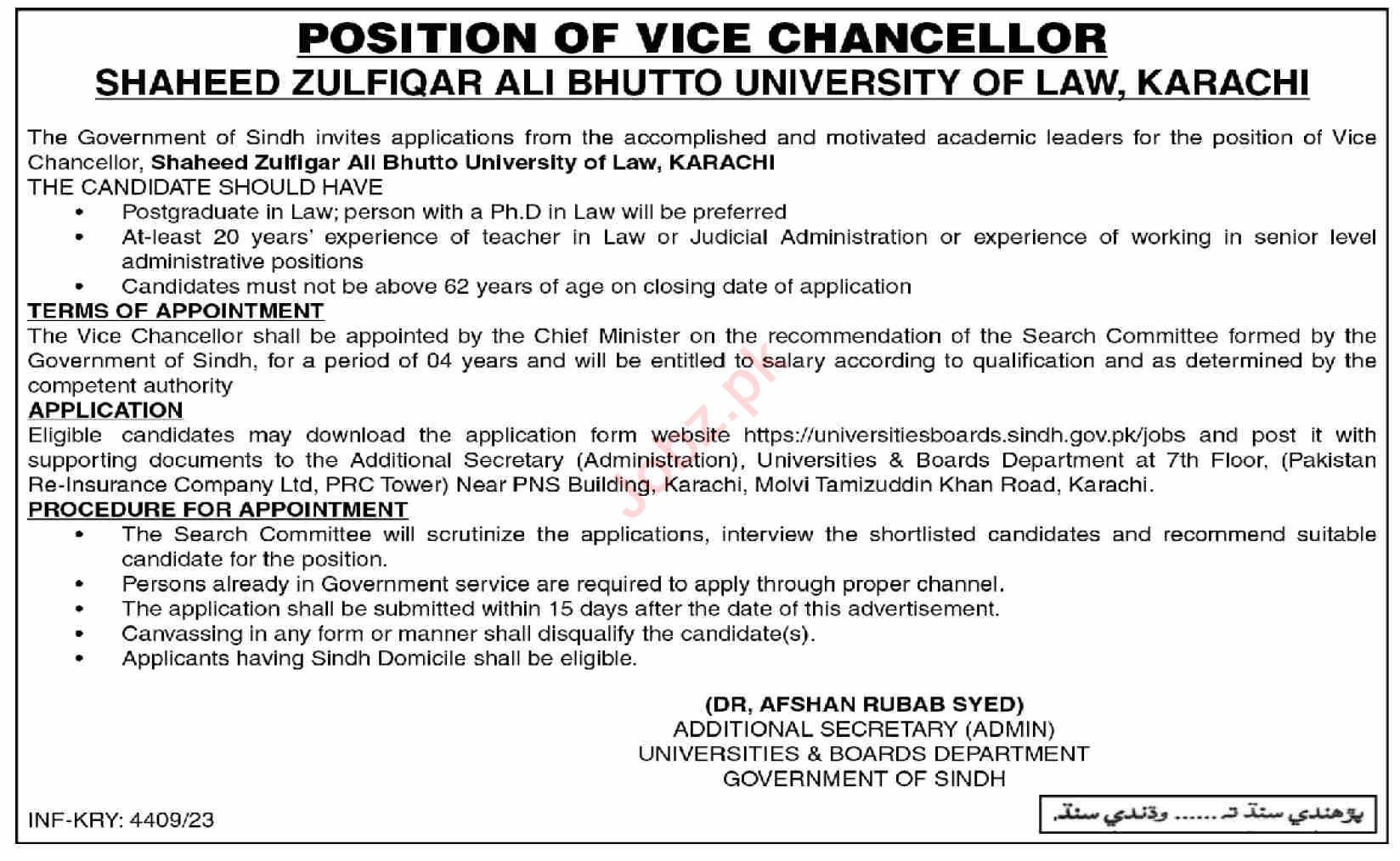 Vacant posts including vice chancellor are announced in Shaheed Zulfiqar Ali Bhutto University of Law SZABUL Karachi, karachi Sindh Pakistan as per 12 November 2023 advertisement in daily Dawn Newspaper. Educational qualifications required Mphil and Phd etc.