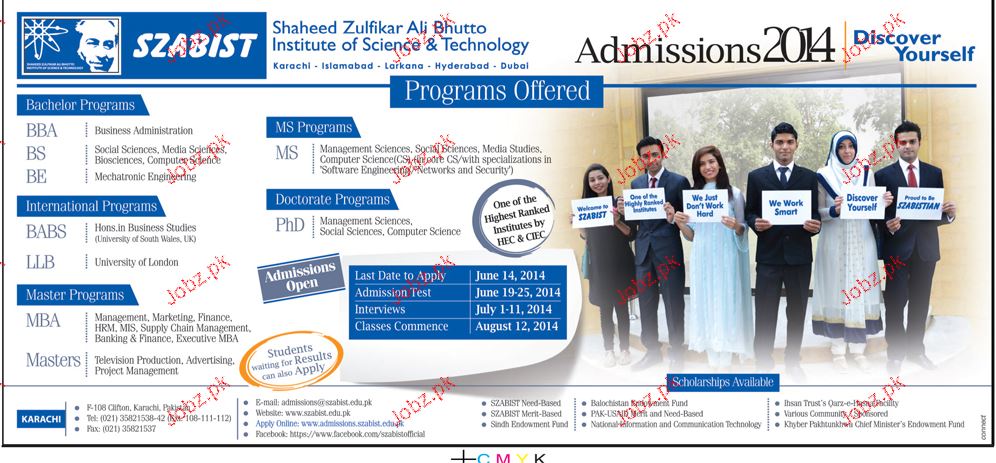 Shaheed Zulifqar Ali Bhutto Institute of Sciences & Technology Admission in BBA, BS, BE, BABS, LLB, MS and Phd in Hyderabad Read newspaper ad for exact details.