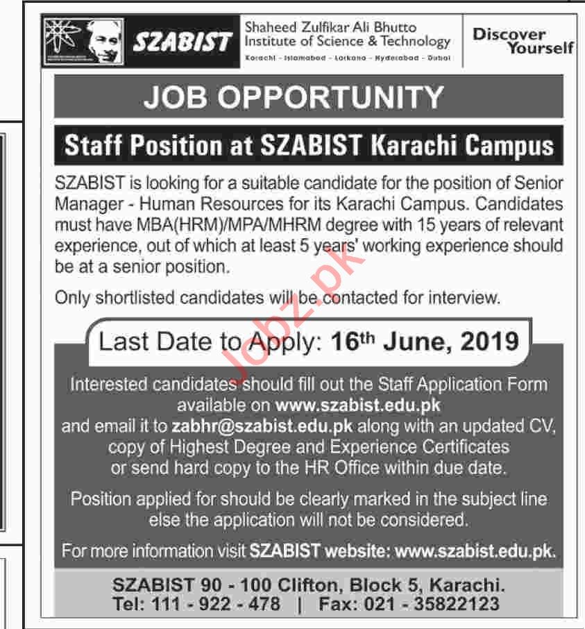 Vacancies in Shaheed Zulfiqar Ali Bhutto Institute of Technology SZABIST Advertisement June 2019