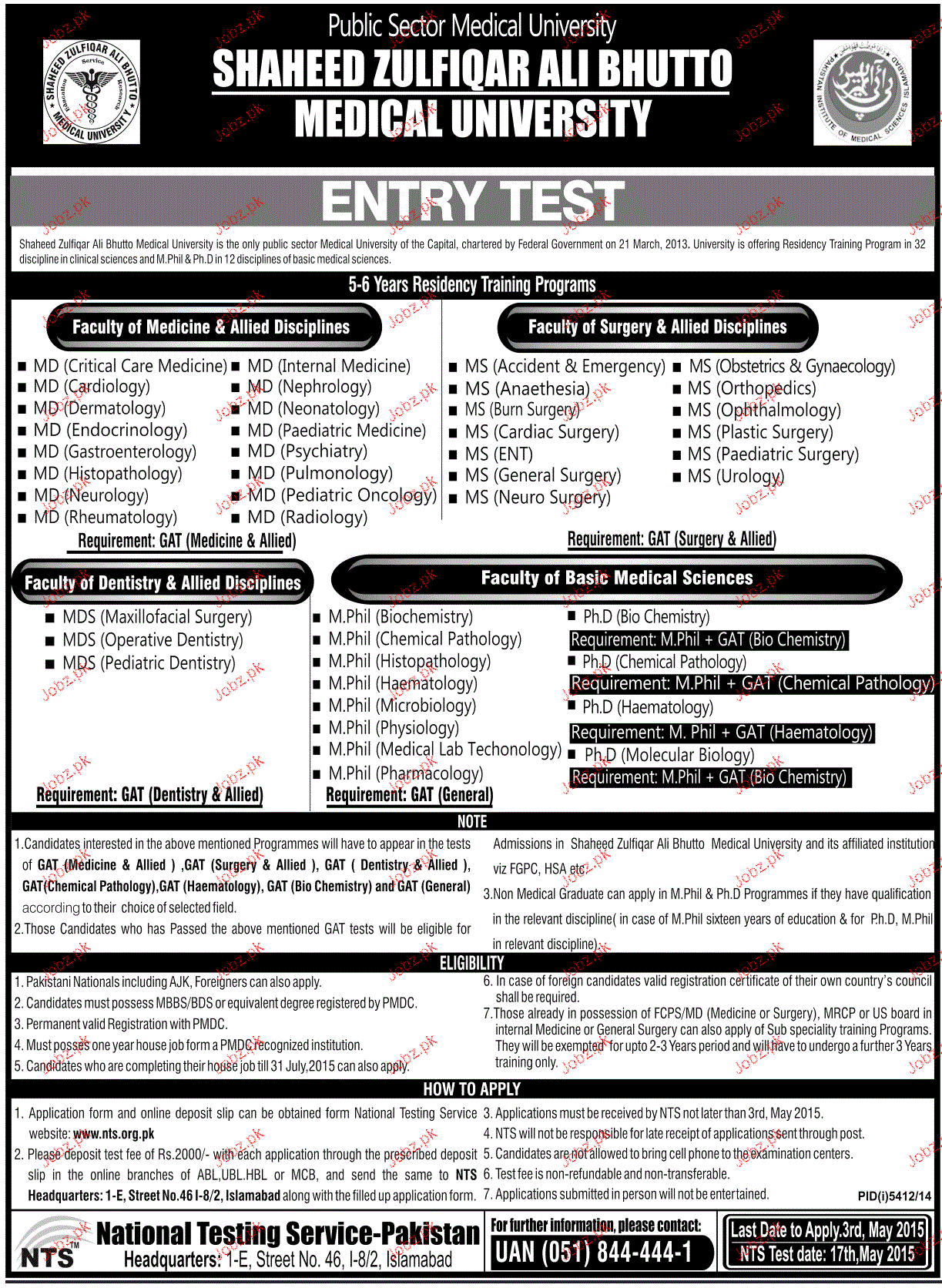 Shaheed Zulifqar Ali Bhutto Medical University Admission in MD, MS and Phill in Larkana. Read newspaper ad for exact details.