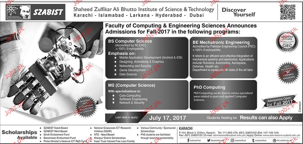Shaheed Zulifqar Bhutto University Admission in BS, BE, MS and Phd in Hyderabad. Read newspaper ad for exact details.