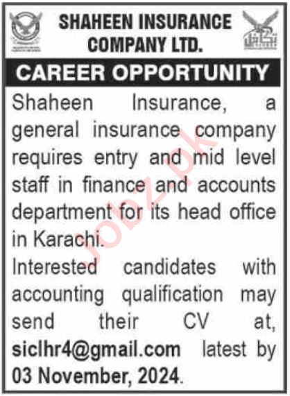 Shaheen Insurance Karachi, karachi Sindh Pakistan invites applications from eligible candidates for the post of accounts officer and finance officer as per advertisement of October 28, 2024 published in daily Dawn Newspaper. Master and Bachelor etc. educational qualification will be preferred.