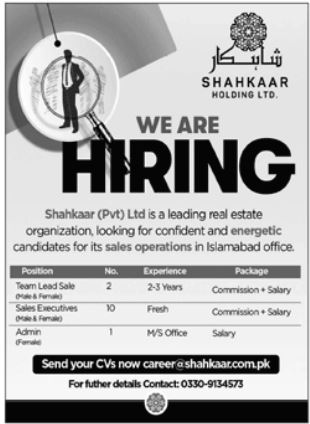 Shahkaar Pvt Limited Islamabad Pakistan invites applications from eligible candidates for the post of sales executive, admin manager and team lead sales as per advertisement of February 13, 2022 published in daily Jang Newspaper. Persons with Master and Bachelor etc. education can apply.