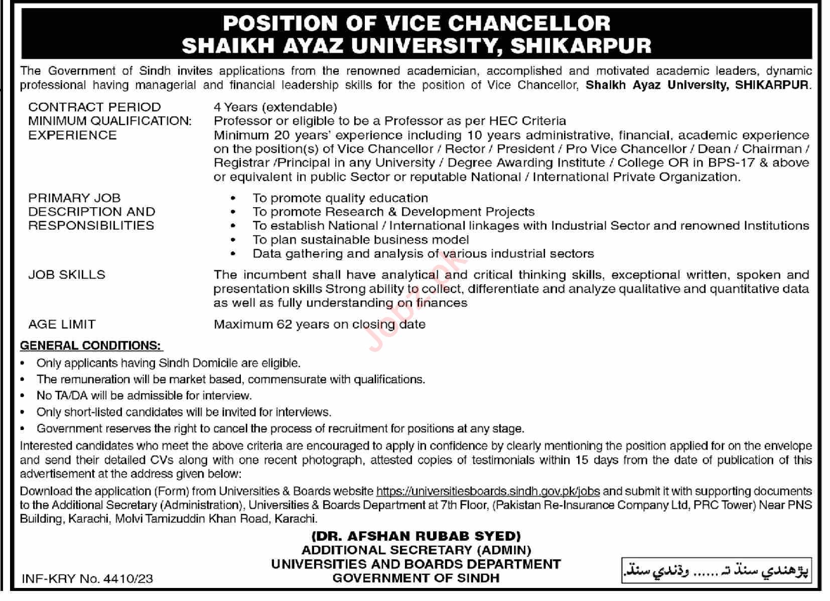Shaikh Ayaz University jobs advertisement dated about 12 November 2023 in daily Dawn Newspaper invites application for the vacant post of vice chancellor in Shikarpur, shikarpur Sindh Pakistan. Persons with Mphil and Phd etc. education can apply.