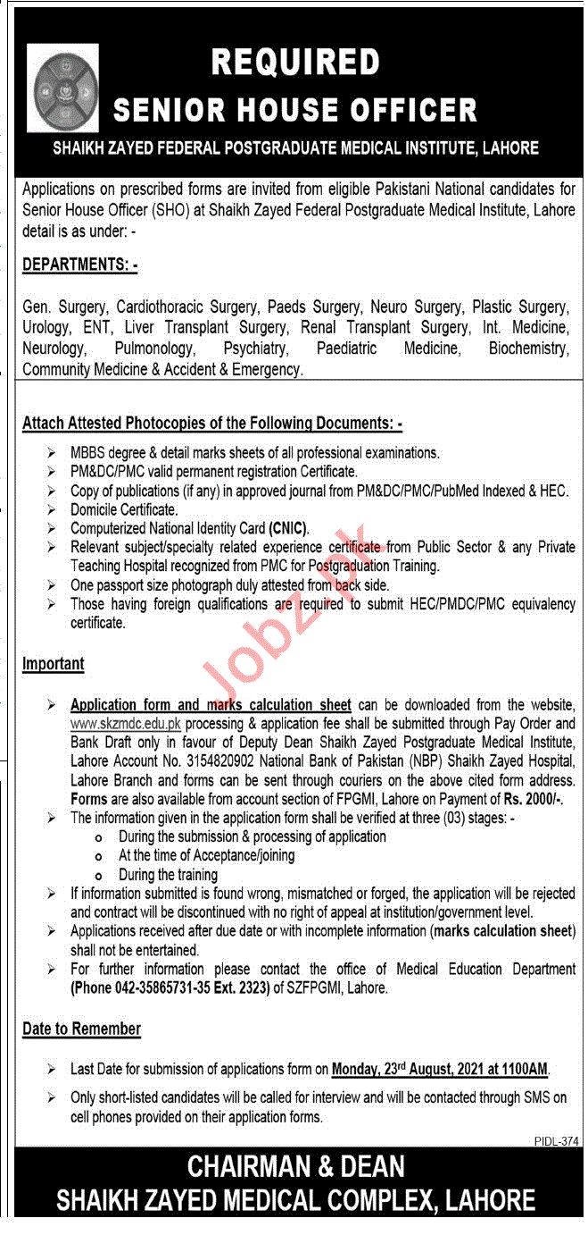 Shaikh Zayed Federal Postgraduate Medical Institute Lahore, Government of Pakistan seeks services for House Officer, Doctor, Lady Doctor, Medical Specialist, Medical Consultant, General Surgery Consultant, Cardio Thoracic Surgery Consultant, ENT Consultant, Liver Transplant Consultant, Renal Transplant Surgery Consultant, Internal Medical Consultant, Neurology Consultant, Psychiatry Consultant, Paediatric Medicine Consultant, Biochemistry Consultant, Community Medicine Consultant, Emergency Consultant.