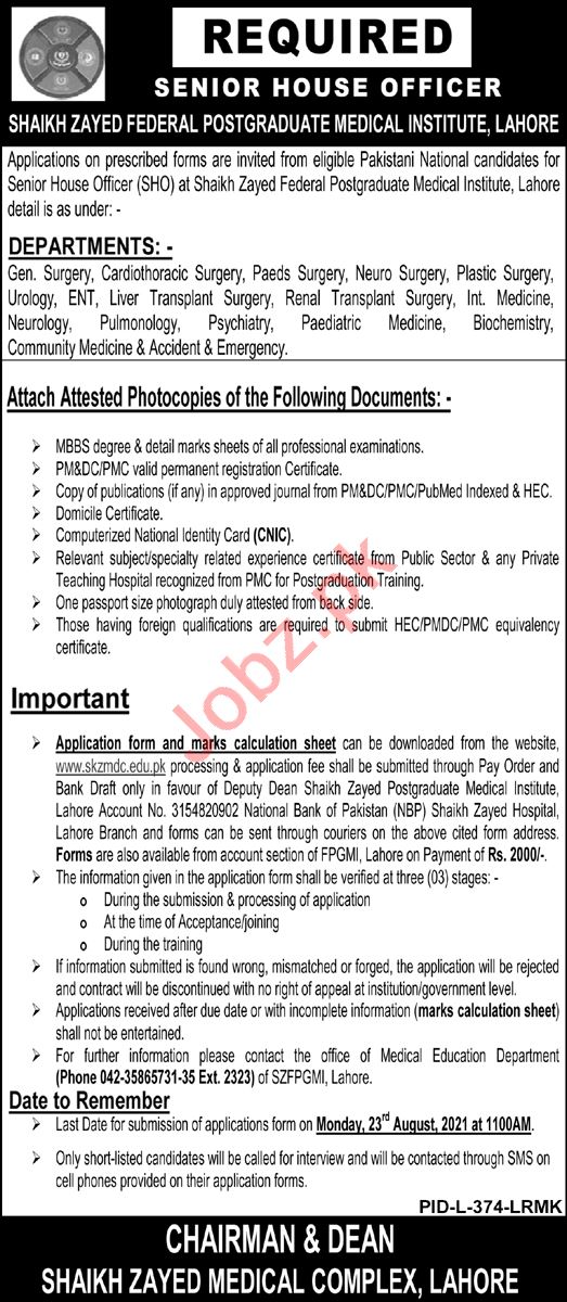 Vacancies in Shaikh Zayed Postgraduate Medical Institute Advertisement August 2021