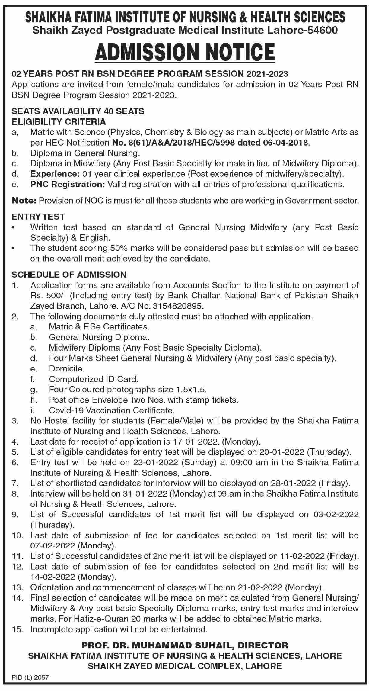Shaikha Fatima Institute of Nursing and Health Sciences admissions 2022 for BSN, Post RN BSN Degree Program has been announced. Students can enroll for admissions in Shaikha Fatima Institute of Nursing and Health Sciences Lahore Punjab Pakistan for academic year 2022 to continue campus based or online education in Medical College. Eligible candidates for admissions in BSN can apply as per Government institute criteria and before closing date 17 January 2022 after reading advertisement online. Read newspaper ad for exact details.