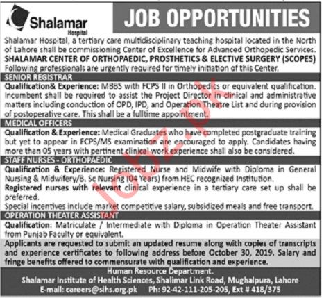 Vacancies in Shalamar Hospital Advertisement October 2019