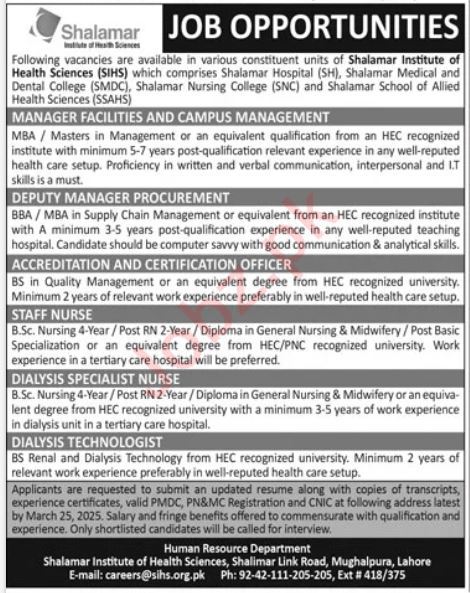 Shalamar Institute of Health Sciences invites applications for job positions advertised in daily Jang dated 16 March 2025 for following vacancies in Mughalpura Lahore, lahore Punjab Pakistan.