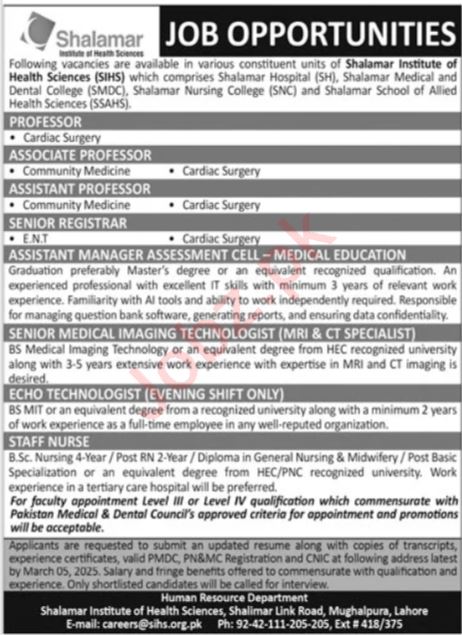 Shalamar Institute of Health Sciences invites applications for job positions advertised in daily Jang dated 23 February 2025 for following vacancies in Mughalpura Lahore, lahore Punjab Pakistan.