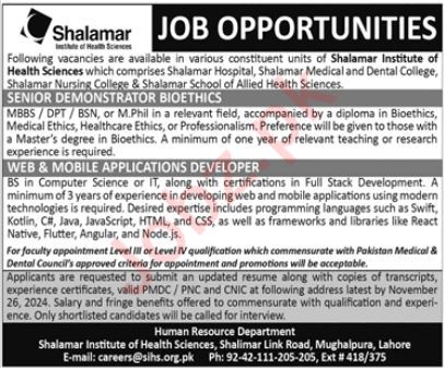 Vacant posts including demonstrator biothics and web mobile application developer are announced in Shalamar Institute of Health Sciences Lahore, lahore Punjab Pakistan as per 17 November 2024 advertisement in daily Jang Newspaper. Educational qualifications required MS, Mphil, Bachelor and Master etc.
