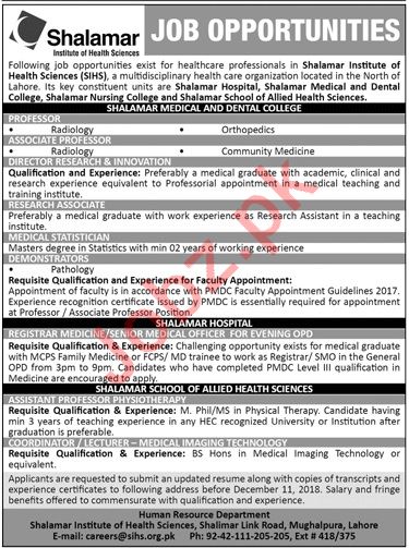Shalamar Institute of Health Sciences SIHS Lahore, Pakistan seeks candidates for the posts of Professor Radiology, Associate Professor Radiology, Associate Professor Community Medicine, Director Research, Research Associate, Medical Statistician, Demonstrator Pathology , Registrar Medicine, Medical Officer, Assistant Professor Physiotherapy, Coordinator, Lecturer, Medical Imaging Technologist.