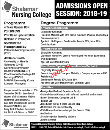 shalamar Nursing College Admission in BSN Nursing Four Year, Four Year Degree Program BSN, 2 Year Degree Program RN and Post Basic Diploma Specialization Pediatric in Lahore. Read newspaper ad for exact details.