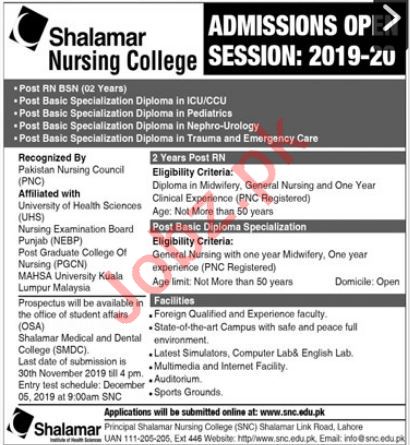 Shalamar Nursing College has announced admissions in Post RN BSN, Post Basic Specialization Diploma in ICU/CCU, Post Basic Specialization Diploma in Pediatrics, Post Basic Specialization Diploma in Nephro Urology, Post Basic Specialization Diploma in Trauma & Emergency Care in Lahore. Read newspaper ad for exact details.