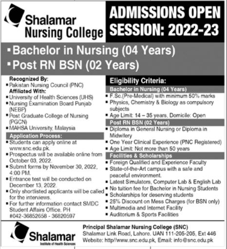 Admissions in Shalamar Nursing College 2022 for Bachelor in Nursing 4 Years. Post RN BSN 2 Years. has been announced. Eligible students who qualify as per admission criteria in Shalamar Nursing College Lahore Punjab Pakistan can apply in Medical College for academic year 2022. Students who want to enroll for academic session 2022 in BS, BSN and Bachelor qualification and admission criteria for Private institute can apply till last date 31 October 2022. Read newspaper ad for exact details.