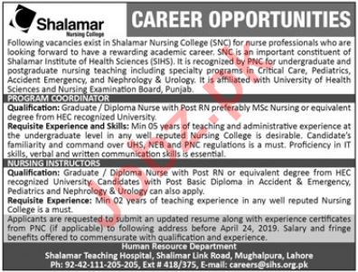 Shalamar Nursing College Programe Coordinator Jobs 2019