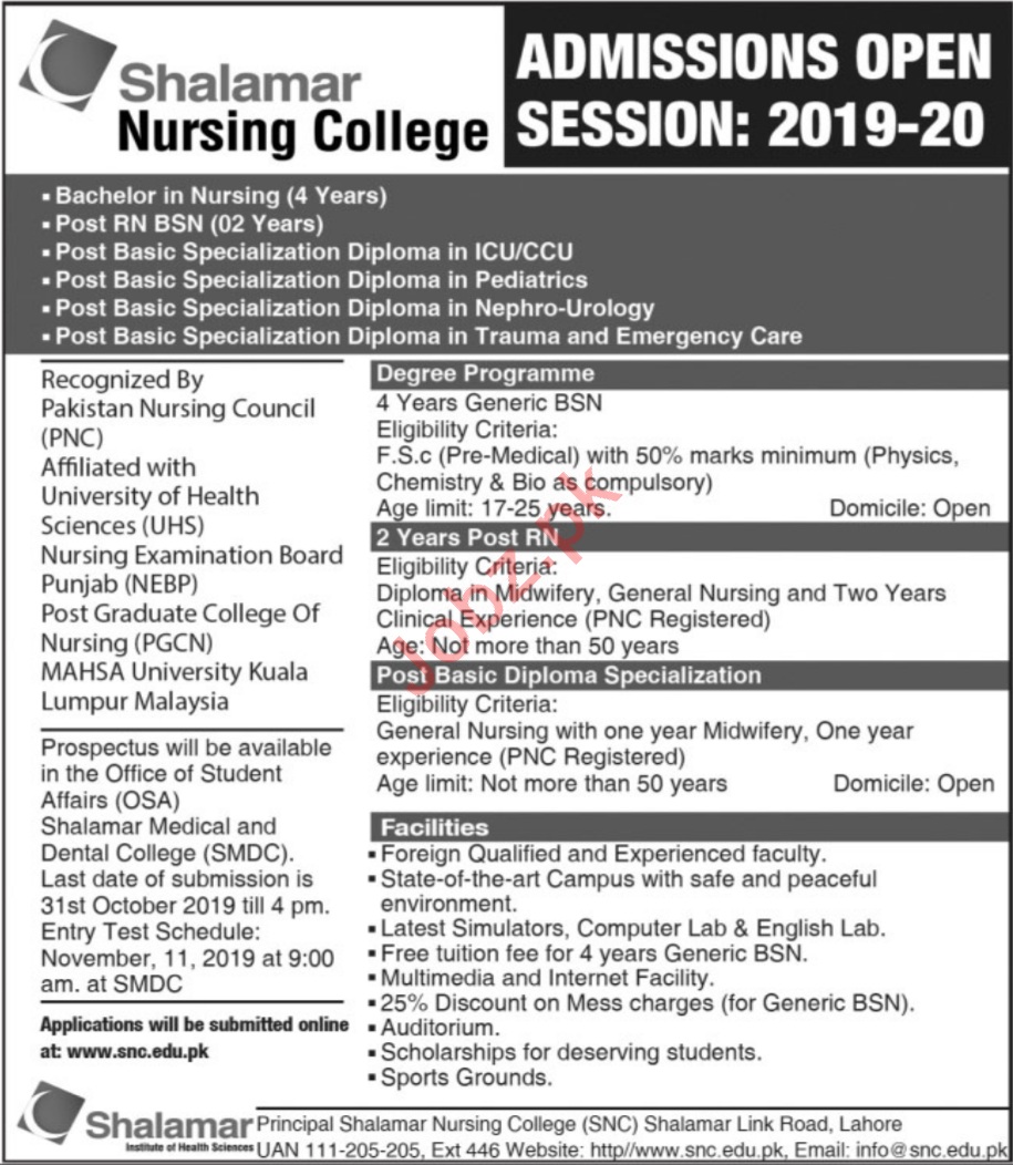 Shalimar Nursing College recognized by Pakistan Nursing Council affiliated with University of Health Sciences has announced admissions in BS Nursing, Post RN BSN, Post Basic Specialization Diploma in ICu/CCU, Post Basic Specialization Diploma in Pediatrics, Post Basic Specialization Diploma in Nephro-Urology, Post Basic Specialization Diploma in Trauma and Emergency Care in Lahore. Read newspaper ad for exact details.