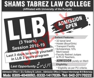 Shams Tabrez Law College STLC Lahore, Pakistan are announced admissions for academic session 2018 to 2019 for the classes of LLB 3 Years Program. Affiliated with University of the Punjab. Read newspaper ad for exact details.