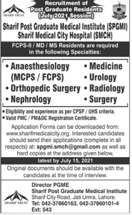 Sharif Post Graduate Medical Institute SPGMI, Sharif Medical City Hospital SMCH invites applications from medical, health, mbbs, doctors and qualified candidates for the posts of Anesthesiology Resident, Medicine Resident, Urology Resident, Orthopedic Surgery Resident, Radiology Resident, Nephrology Resident and Surgery Resident in Lahore.