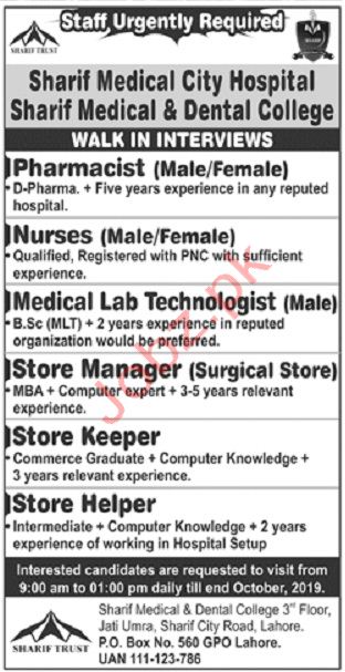 Vacancies in Sharif Medical City Hospital Advertisement October 2019
