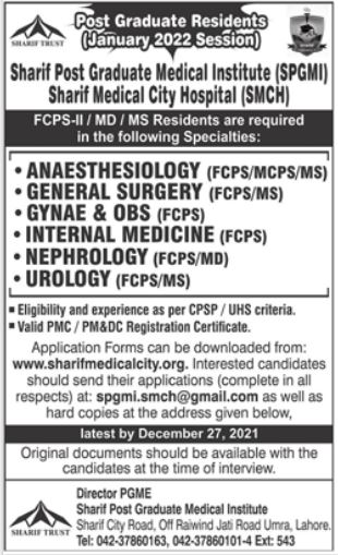 Vacancies in Sharif Medical City Hospital SMCH Advertisement December 2021