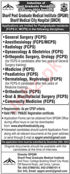 Sharif Post Graduate Medical Institute SPGMI jobs advertisement dated about 10 December 2023 in daily Jang Newspaper invites application for the vacant post of fcps trainee in gynaecology obstetrics, fcps trainee in oral maxillofacial surgery, fcps trainee in general surgery, fcps trainee in radiology, fcps trainee in community medicine, fcps trainee, fcps trainee in orthopedic surgery, fcps trainee in anesthesiology, mcps trainee in anesthesiology, fcps trainee in dermatology, postgraduate resident trainee, fcps trainee in medicine, fcps trainee in orthodontics, fcps trainee in peadtiatrics and fcps trainee in nephrology in Lahore, lahore Punjab Pakistan. Persons with MBBS, Others and P.G Diploma etc. education can apply.