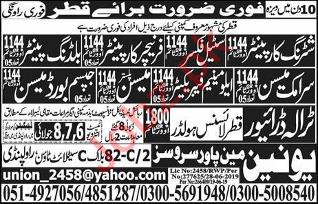 Union Manpower Services is looking for highly experienced and energetic candidates for the posts of Shattering Carpenter, Steel Fixer, Furniture Carpenter, building Painter, Ceramic Masson, Aluminum Fabricator, Masson, Gypsum Board Masson, Trailer Driver in Qatar. Interested candidates can contact for more details.