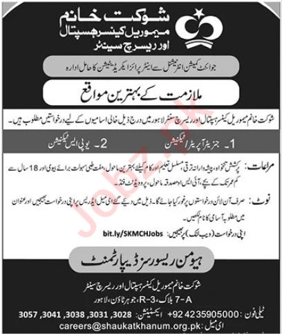 Vacant posts including generator technician, ups technician and generator operator are announced in Shaukat Khanum Memorial Cancer Hospital & Research Centre Lahore, lahore Punjab Pakistan as per 3 November 2024 advertisement in daily Jang Newspaper. Preferred Education is DAE and Matric etc.