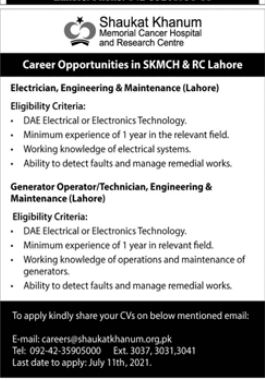 Latest Shaukat Khanum Memorial Cancer Hospital & Research Centre Engineering Posts Lahore 2025