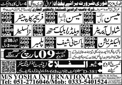 New Al Falah Trade Test & Training Center invites applications for job positions advertised in daily Express dated 8 March 2025 for following vacancies in Baghdad, basra Iraq.