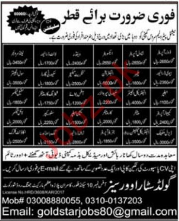 Doors Operator, Shawl Operator, Excavator Operator, Welder, LTV Driver, Driver, Land Surveyor, HTV Driver, Plumber, Concrete Mixer, Civil Engineer, Engineer, Helper, Electrical Engineer, Security Supervisor, Office Boy, Shuttering Carpenter, Steel Fixer, Computer Operator, Painter, Carpenter, Kitchen Helper, Store Keeper, Diesel Mechanic, Electrical Technician, Generator Operator, Accounts Clerk needs in well reputed company.