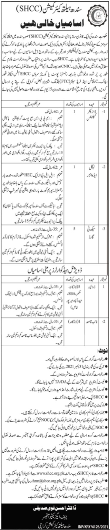 Vacancies in Sindh Health Care Commission SHCC Advertisement November 2021