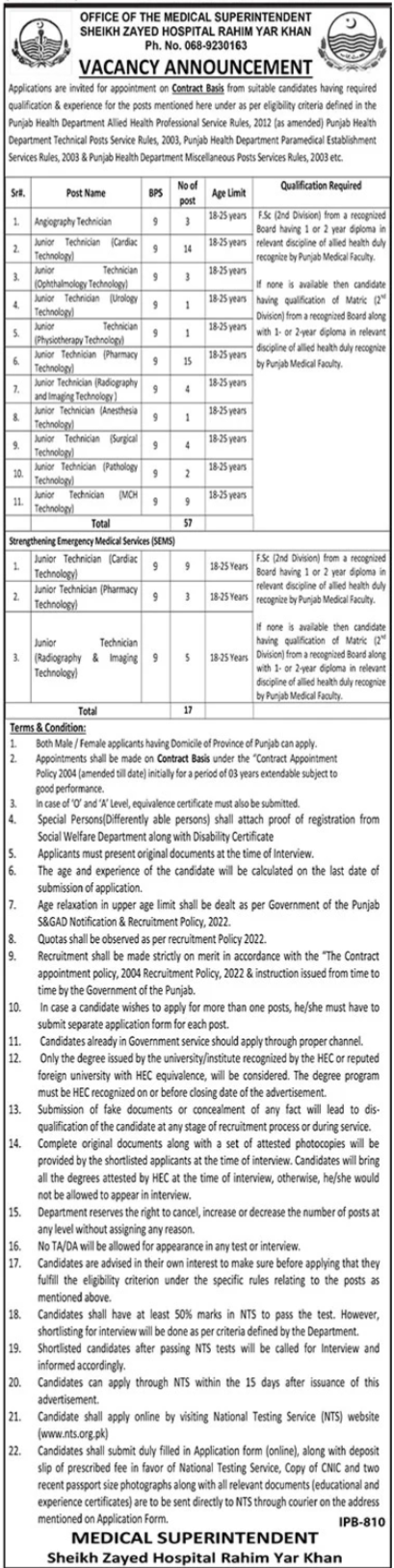 Sheikh Zayed Hospital Rahim Yar Khan, rahim yar khan Punjab Pakistan invites applications from eligible candidates for the post of mch technology technician, technician, pathology technology technician, cardiac technology technician, pharmacy technology technician, surgical technology technician, anesthesia technology technician, angiography technician, imaging technology technician, urology technology technician, physiotherapy technology technician, radiology technology technician and technician ophthalmology technology as per advertisement of December 25, 2024 published in daily The News Newspaper. Educational qualifications required Intermediate and DAE etc.