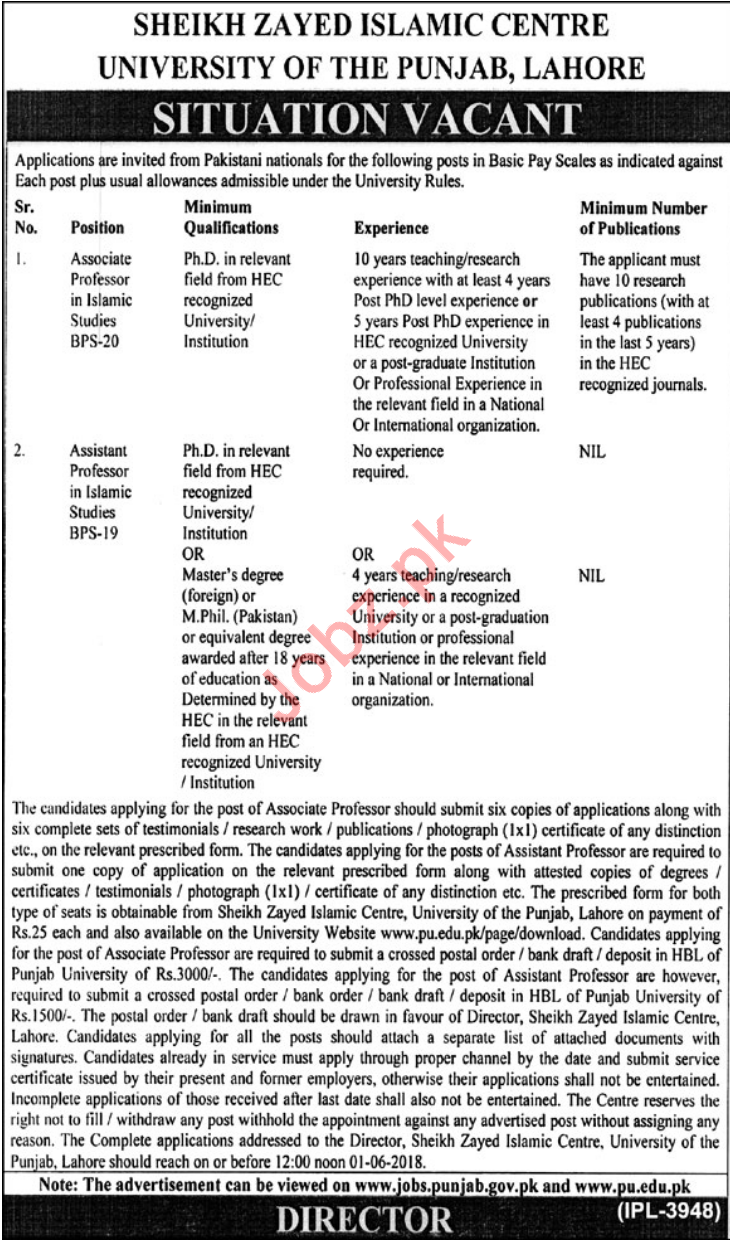 Sheikh Zayed Islamic Center SZIC Lahore Jobs 2018