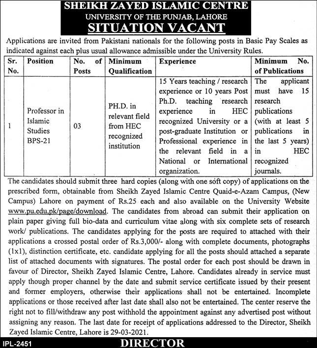 Latest Sheikh Zayed Islamic Centre Education Posts Lahore 2025