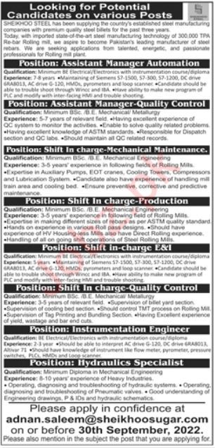 Vacancies in Sheikhoo Sugar Advertisement September 2022