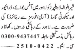 Sheranwala Developer Wapda Town Lahore, lahore Punjab Pakistan invites applications from eligible candidates for the post of driver, office boy and security guard as per advertisement of October 11, 2025 published in daily Jang Newspaper. Preferred Education is Middle, Matric and Primary etc.