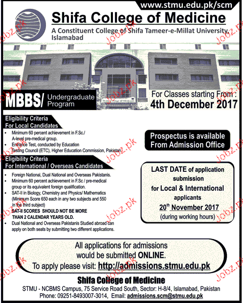 Shifa College of Medicine Admission in MBBS Undergraduate Programs in Islamabad. Classes will be start from 04th December 2017.Last date for submission of admission forms is 20 November 2017. Read newspaper ad for exact details.