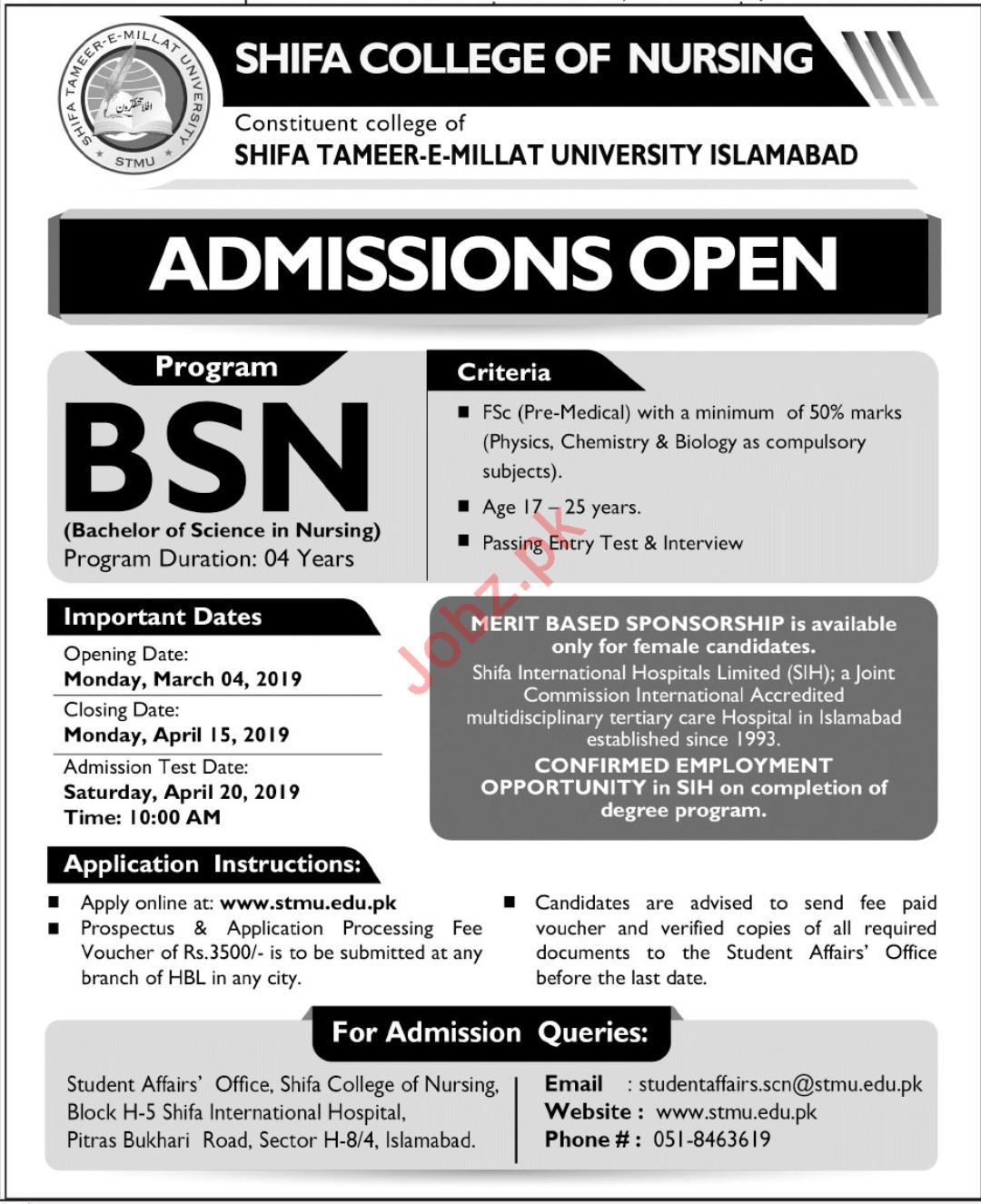 Shifa College of Nursing Islamabad, Shifa Tameer e Millat University, Pakistan are started admissions spring 2019 for the posts of BSN Bachelor of Science of Nursing . Read newspaper ad for exact details.