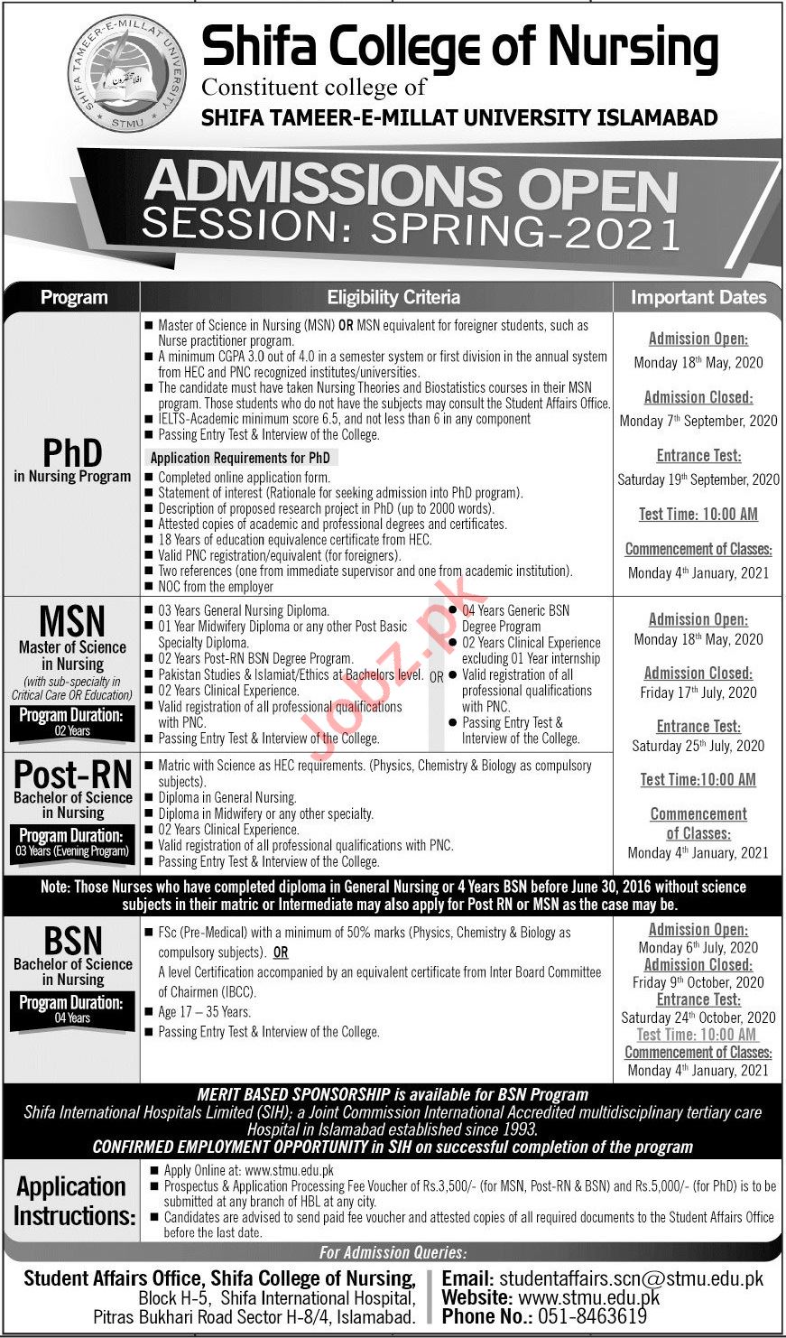 Shifa College of Nursing Islamabad, Pakistan is opening admissions fall 2020 for the classes of PhD in Nursing Program, MSN, Post RN Bachelor of Science in Nursing. Read newspaper ad for exact details.