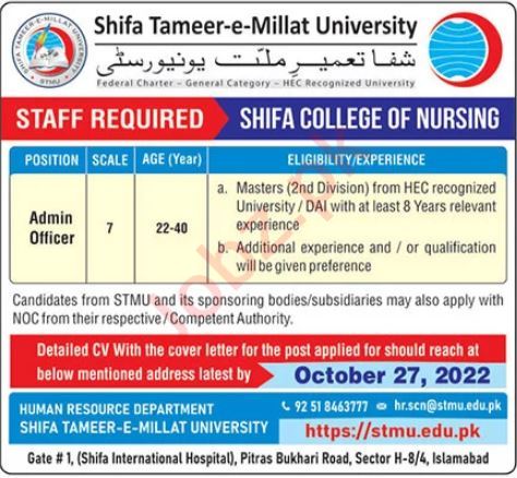 Shifa Tameer e Millat University STMU is looking for candidates for following posts as per job advertisement published in daily The News Newspaper of October 16, 2022 for location Islamabad, islamabad Islamabad Pakistan: