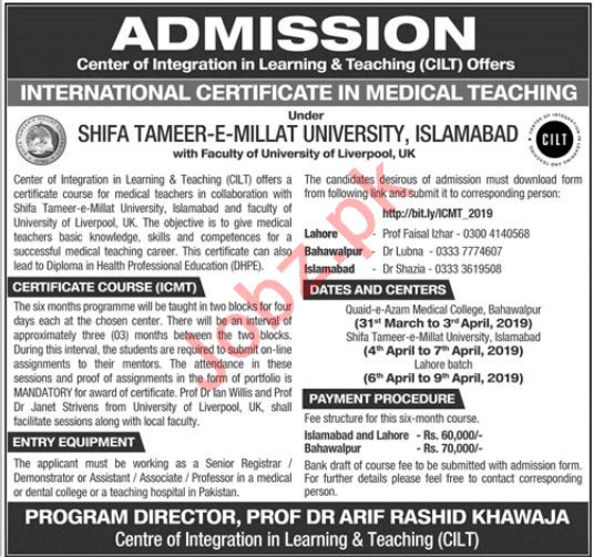Shifa Tameer-e-Millat University has announced Admission for the Course of Center of Integration in Learning & Teaching CILT in Islamabad and Bahawalpur. Interested Student can submit their Admission Form Before Last Date. Read newspaper ad for exact details.