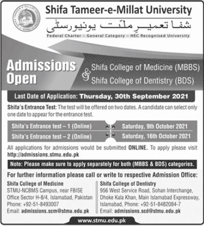 Shifa Tameer e Millat University STMU invites applications for admissions in Bachelor of Medicine, Bachelor of Surgery MBBS and Bachelor of Dental Surgery BDS in Karachi. Read newspaper ad for exact details.