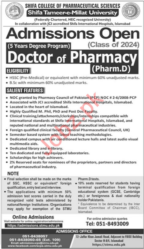 Shifa Tameer e Millata University, Shifa College of Pharmaceutical Sciences has announced admissions in Doctor of Pharmacy PHarm D 5 years Degree Program in Islamabad. Read newspaper ad for exact details.