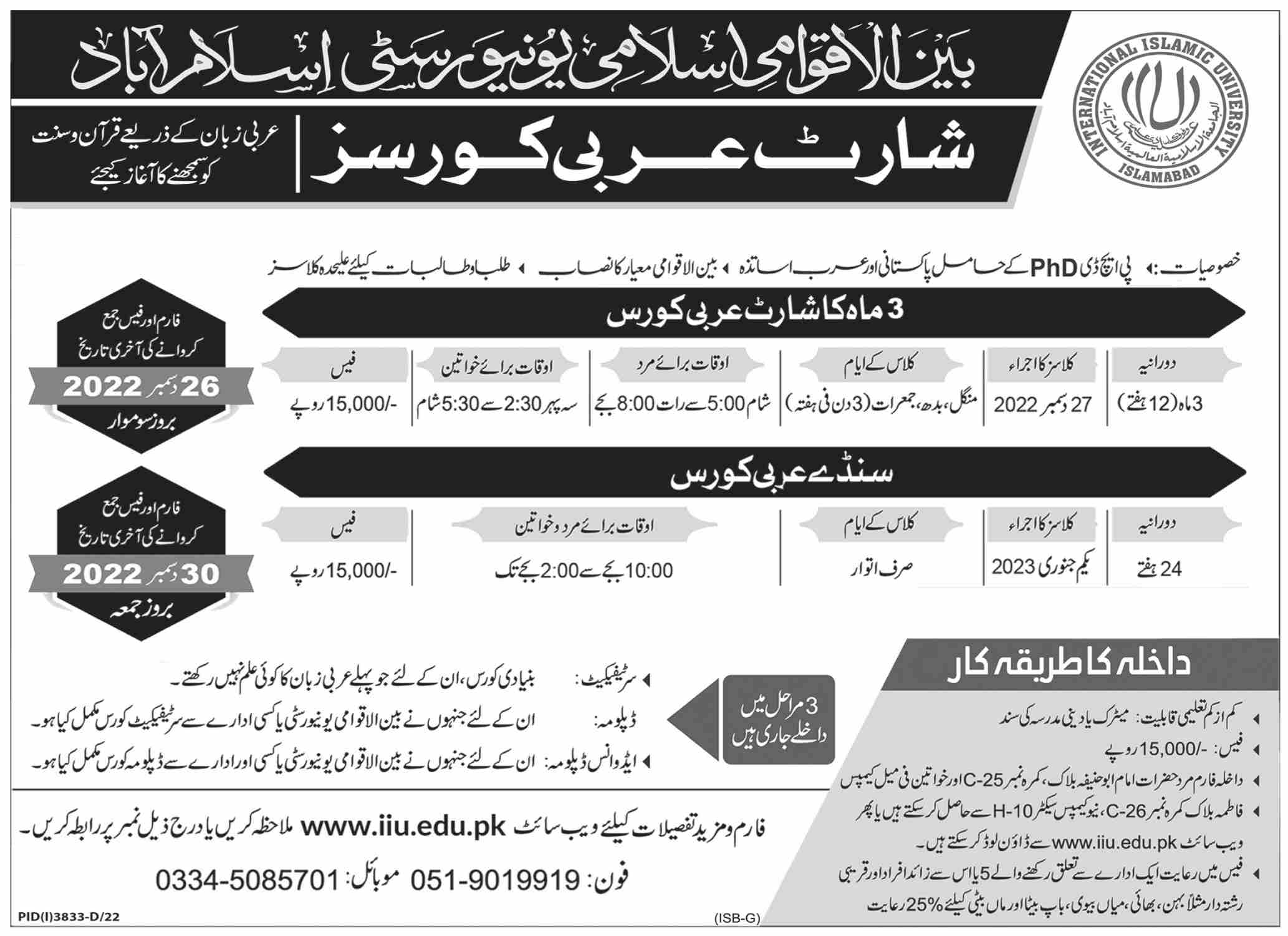 Short Arabic Courses admissions at International Islamic University Islamabad
