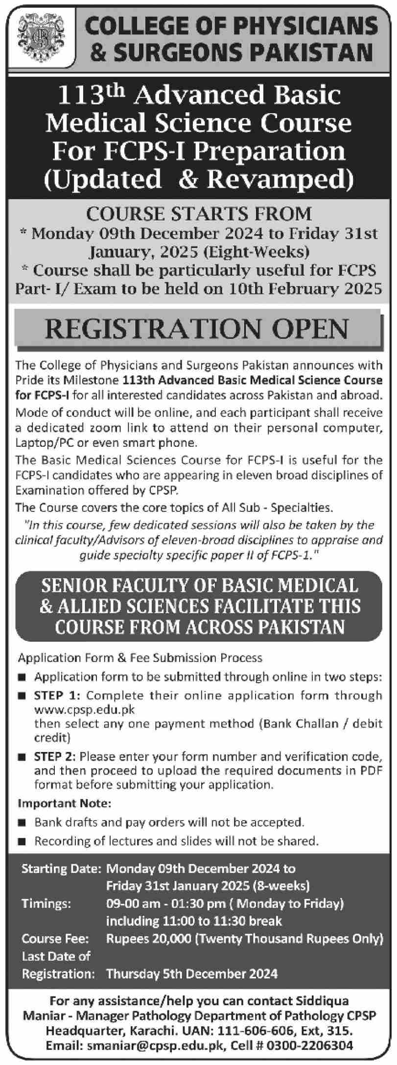 College of Physicians and Surgeons Pakistan has announced admissions 2024 for Advanced Basic Medical Science Course. College of Physicians and Surgeons Pakistan Karachi Sindh Pakistan welcomes students to apply for admissions in academic year 2024 in Science University. Students for admissions in Course can apply for online or campus classes as per Government institute criteria till admission closing date December 5, 2024. Read newspaper ad for exact details.