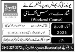 Baseerah Institute has announced admissions 2025 for Short Courses . Eligible students who qualify as per admission criteria in Baseerah Institute Rawalpindi Punjab Pakistan can apply in Science Course for academic year 2025. Students for admissions in & criteria can apply as per Private institute admission policy 2025 before closing date as per advertisement. Read newspaper ad for exact details.