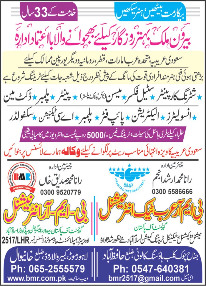 BMR Arab Tech International has announced admissions 2024 for Shuttering Carpenter, Steel Fixer, Mason, Painter, Plumber, Duct Man, Insulator, Electrician, Pipe Fitter, Plumber, AC Technician, Scaffolder. Students who want to take admissions in BMR Arab Tech International Hafizabad Khanewal Punjab Pakistan for academic year 2024 to continue education in Technical Course can apply. Students for admissions in Course & criteria can apply as per Private institute admission policy 2024 before closing date March 4, 2024 as per advertisement. Read newspaper ad for exact details.