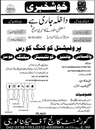 Government College of Technology has announced admissions 2023 for Short Courses. Eligible students can apply for academic admissions 2023 in Government College of Technology Lahore Punjab Pakistan for Science College. Students for admissions in Course & criteria can apply as per Government institute admission policy 2023 before closing date September 2, 2023 as per advertisement. Read newspaper ad for exact details.